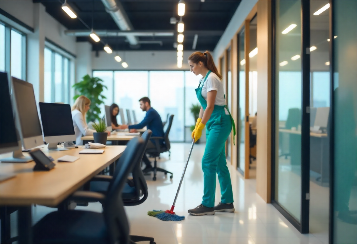 Services include floors, desks, restrooms, and common areas – ensuring productivity in a spotless environment.